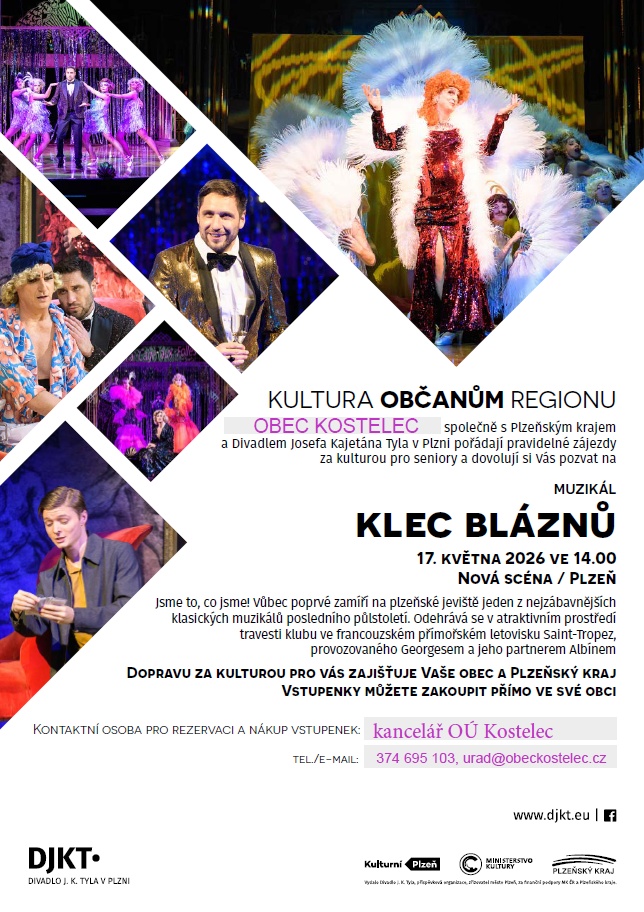 Obec Kostelec ve spolupráci s Plzeňským krajem a Divadlem Josefa Kajetána Tyla v Plzni vás srdečně zve na muzikál Klec bláznů. Tento zábavný muzikál se poprvé představí na plzeňském jevišti a odehrává se v travesti klubu ve francouzském letovisku Saint-Tropez. Akce bude probíhat 17. května 2026 od 14:00 v Nové scéně. Dopravu zajišťuje Vaše obec a Plzeňský kraj. Vstupenky si můžete zakoupit přímo ve své obci, kde je k dispozici kontaktní osoba pro rezervaci a nákup vstupenek.